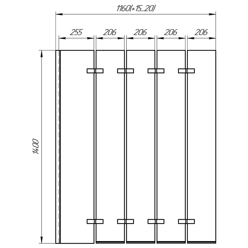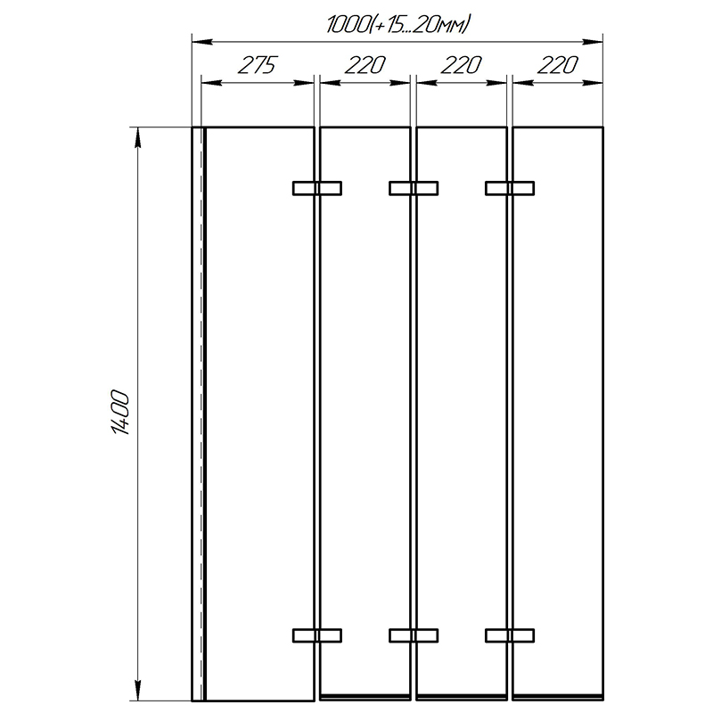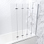 Шторка выполнена из четырех стеклянных секций, которые складываются по принципу гармошки. Это позволяет шторке занимать минимум места в сложенном положении. Габаритные размеры шторки в полную величину — 140х80 см.